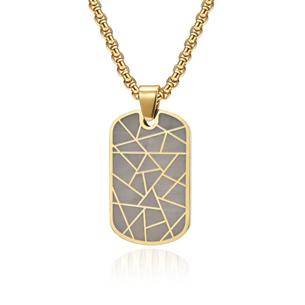 Men’s Geometric Crack Pattern Dog Tag Pendant Necklace, Titanium Steel, Two-Tone Design, 22x38mm Pendant, 60cm Chain